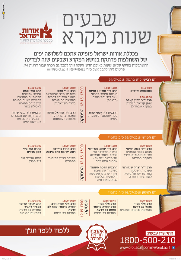 ההשתלמות השנתית לתנ"ך תתקיים השנה בימים רביעי, חמישי וראשון – כ"א, כ"ב, כ"ב בתמוז (4,5,8 ביולי) בין השעות 9:00 – 16:00, בקמפוס רחובות, רח' צבי שטיינמן 3 .